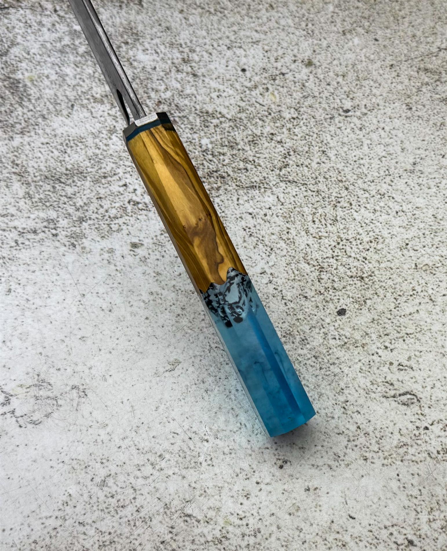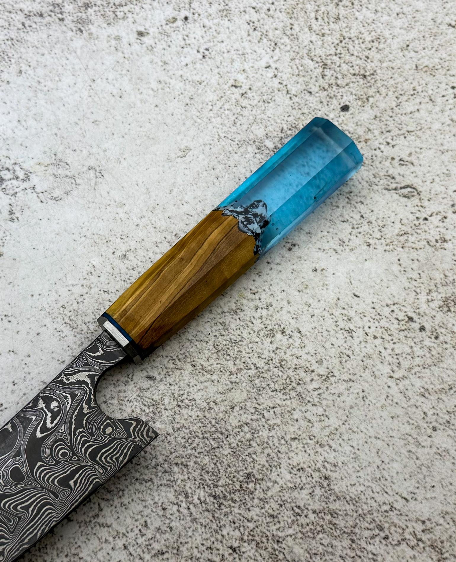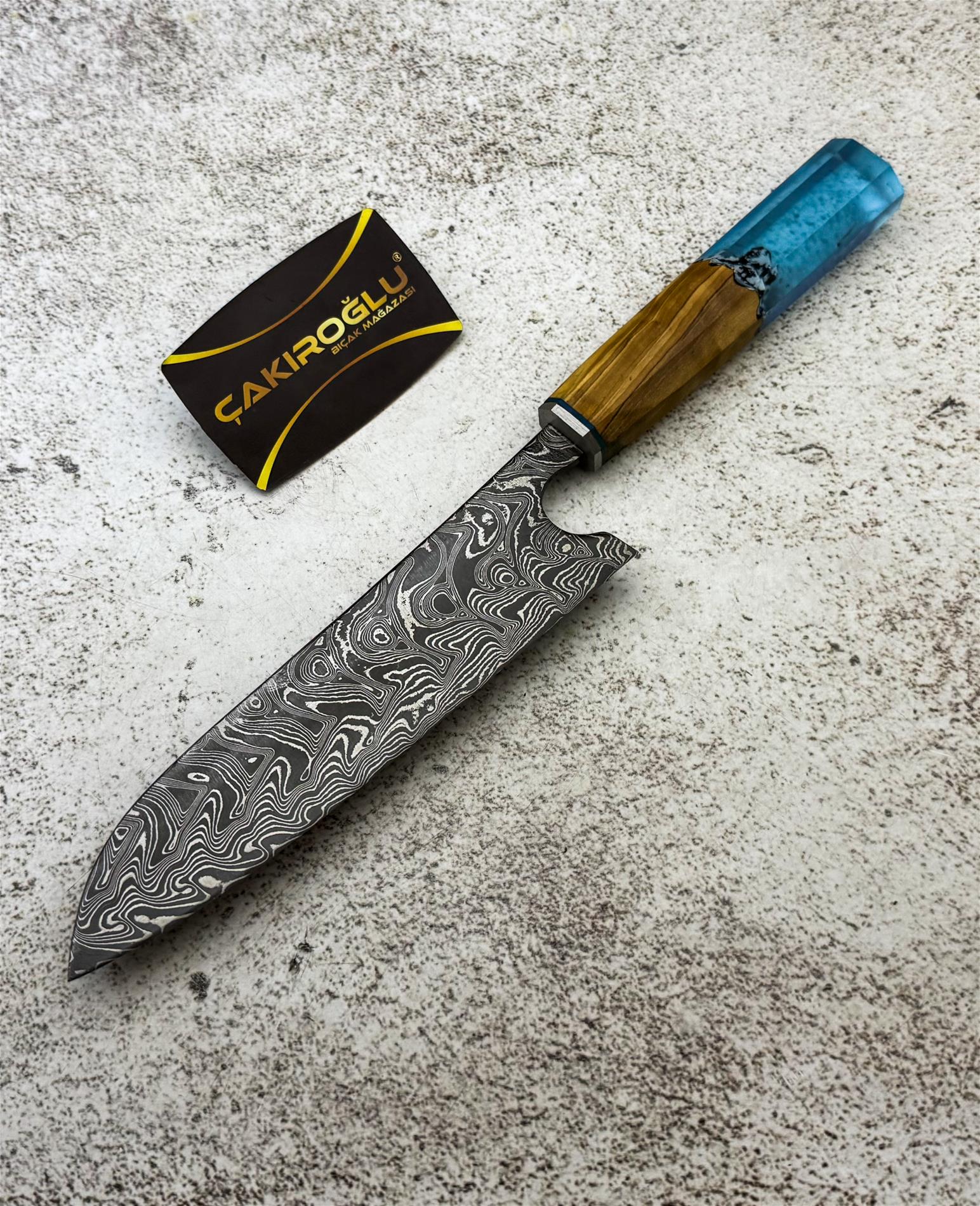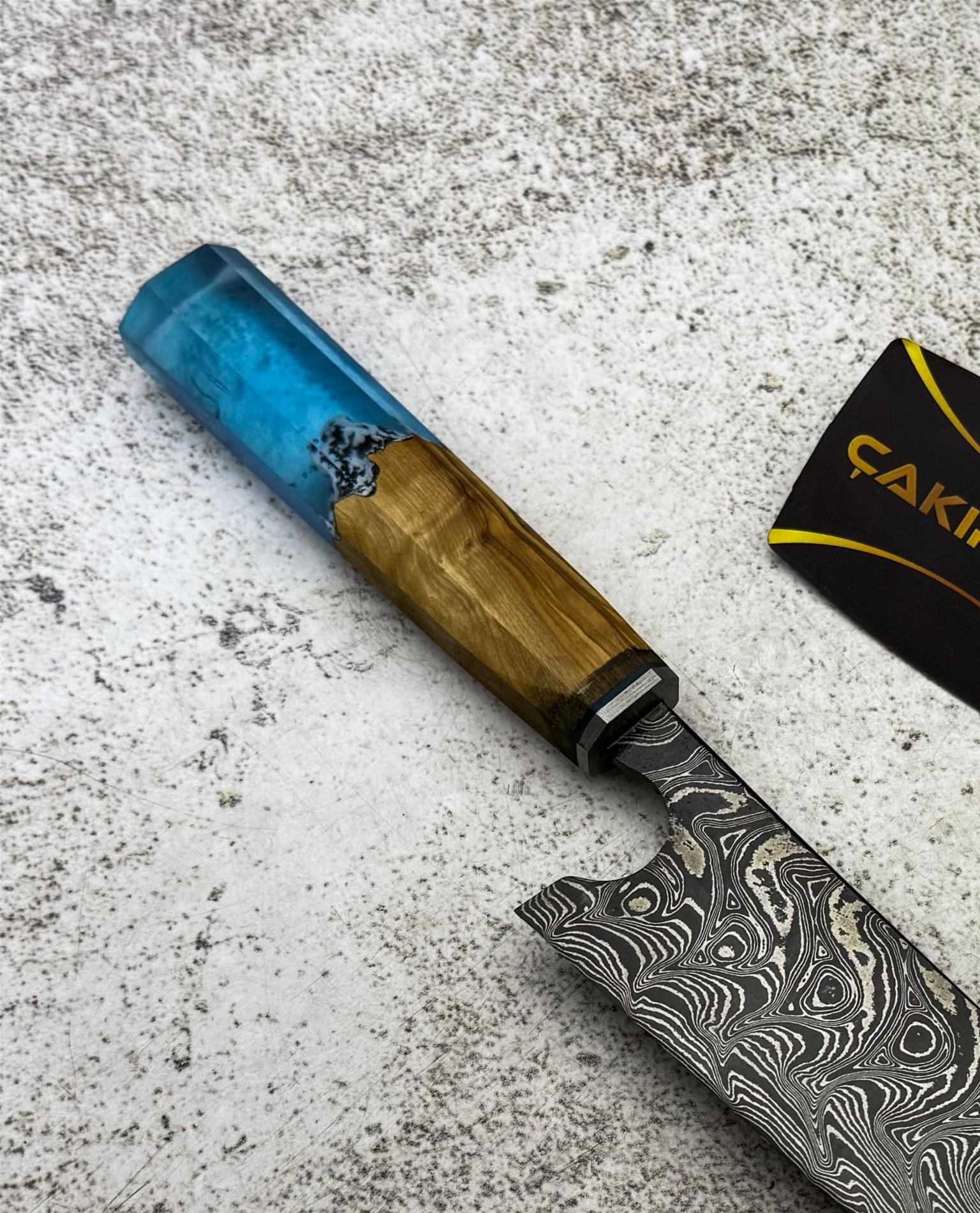 EL YAPIMI DAMASCUS ÇELİK ZEYTİN AĞACI VE EPOKSİ KABZELİ PROFESYONEL ŞEF AŞÇI BIÇAĞI KOD:CKR790