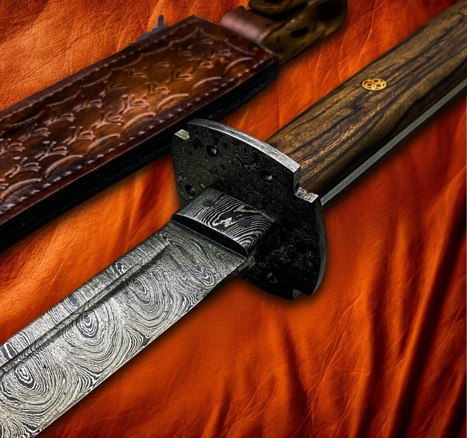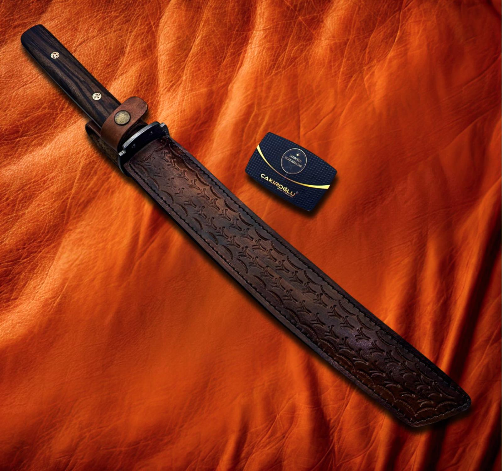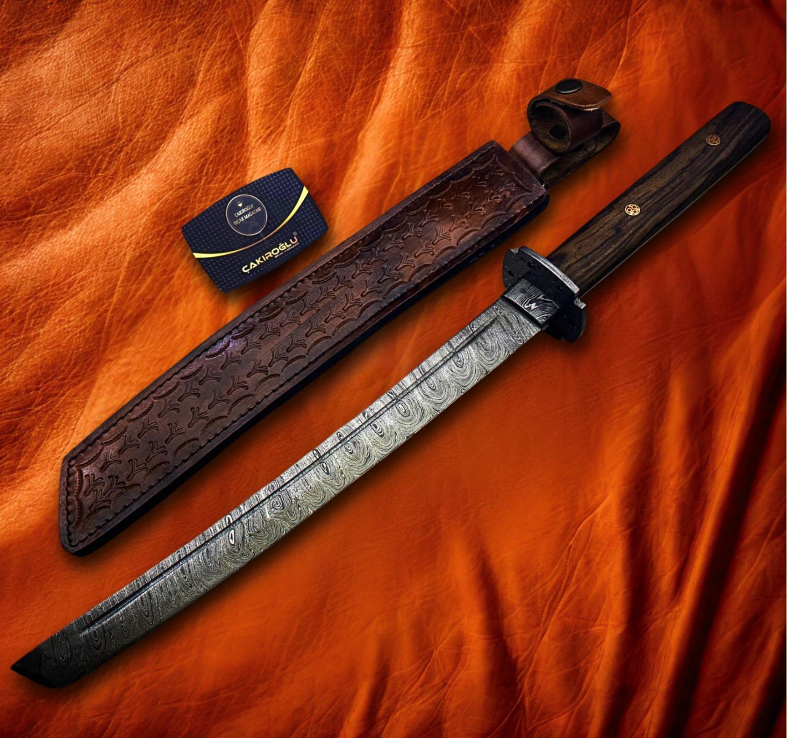 EL YAPIMI ÖZEL ÜST DÜZEY ŞAHESER DAMASCUS ÇELİK KÖK CEVİZ KABZELİ VE DERİ KILIFLI KATANA (Wakizashi)
