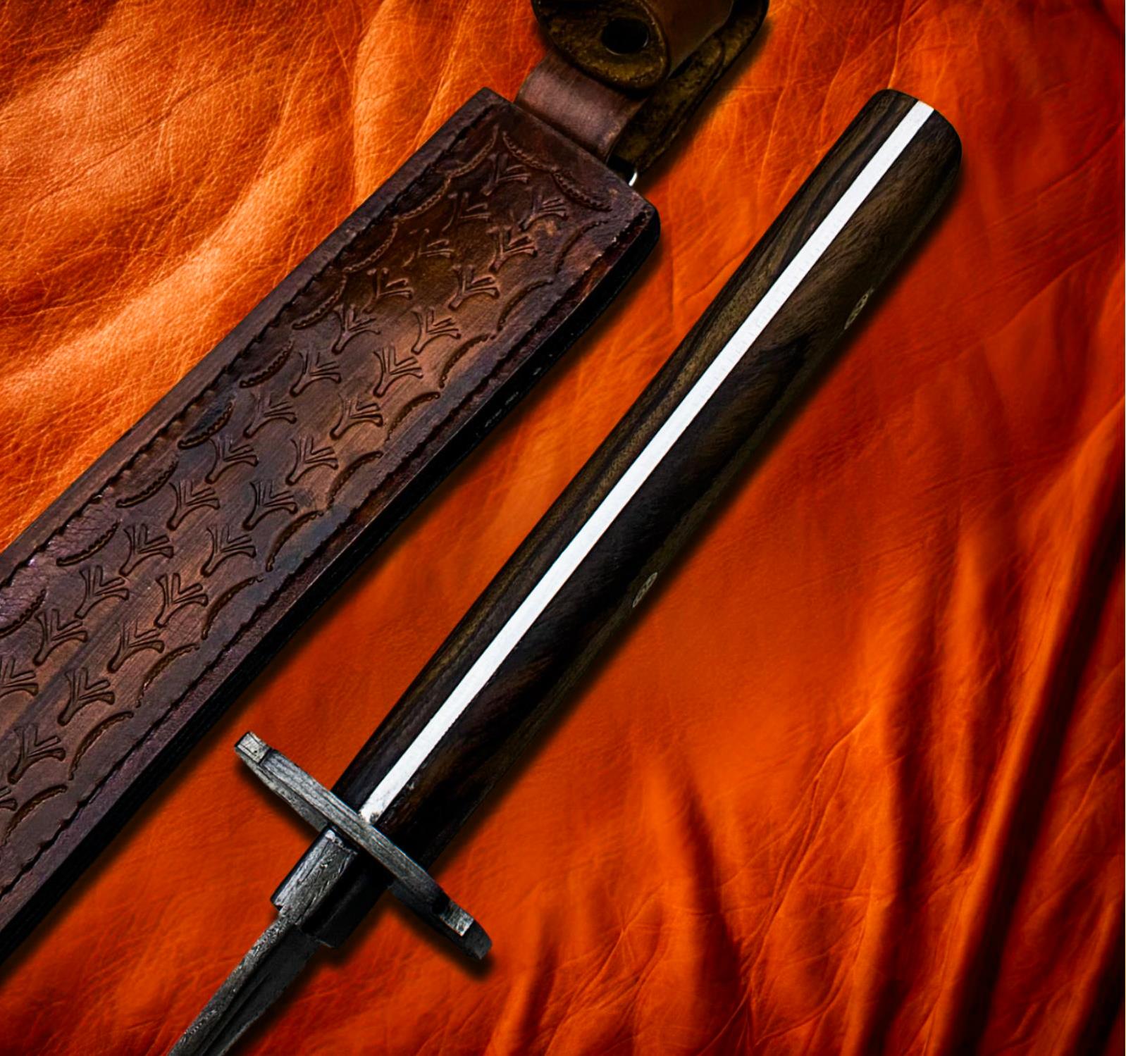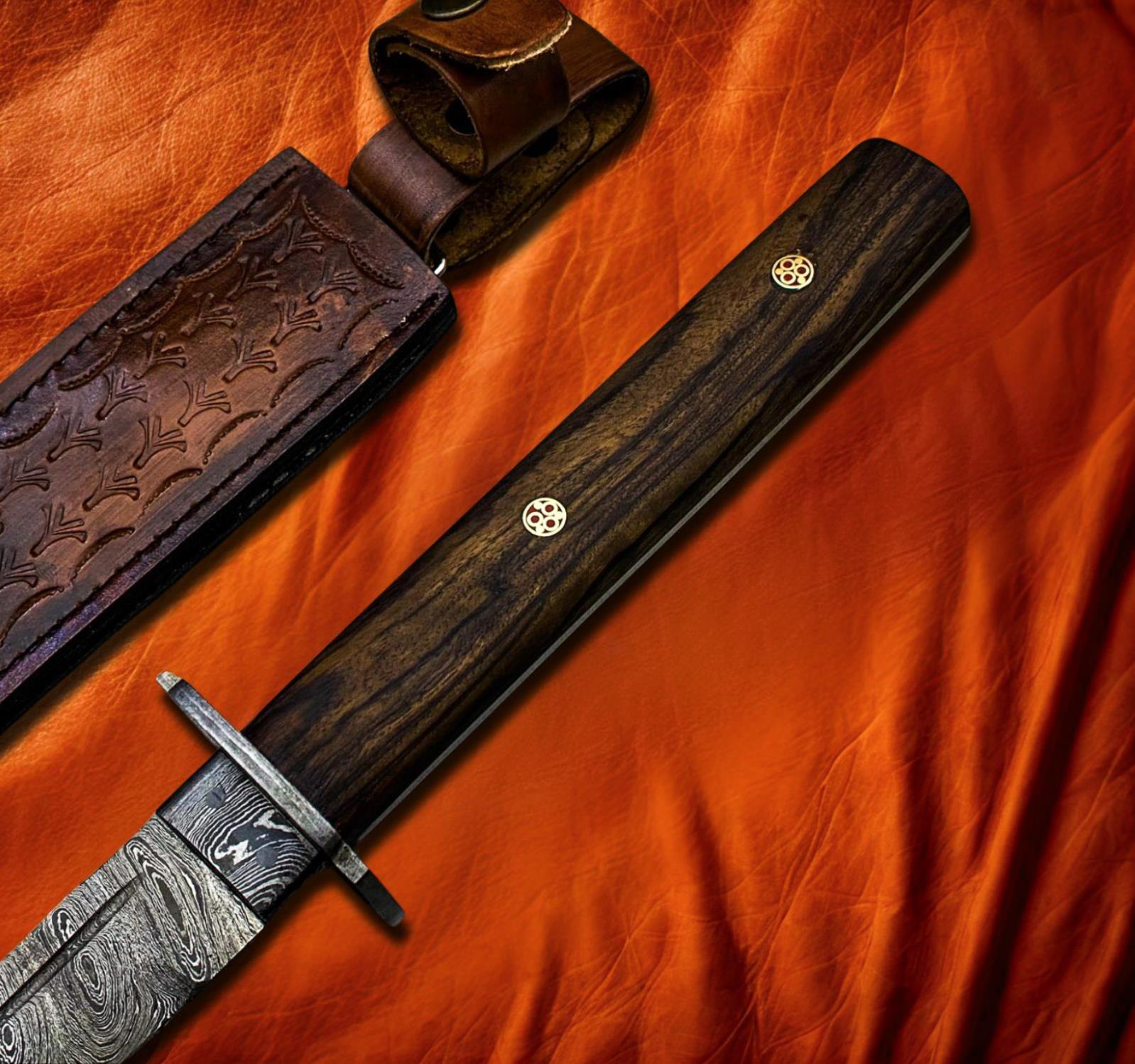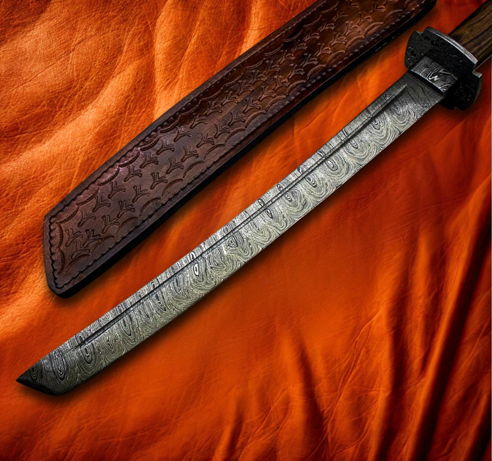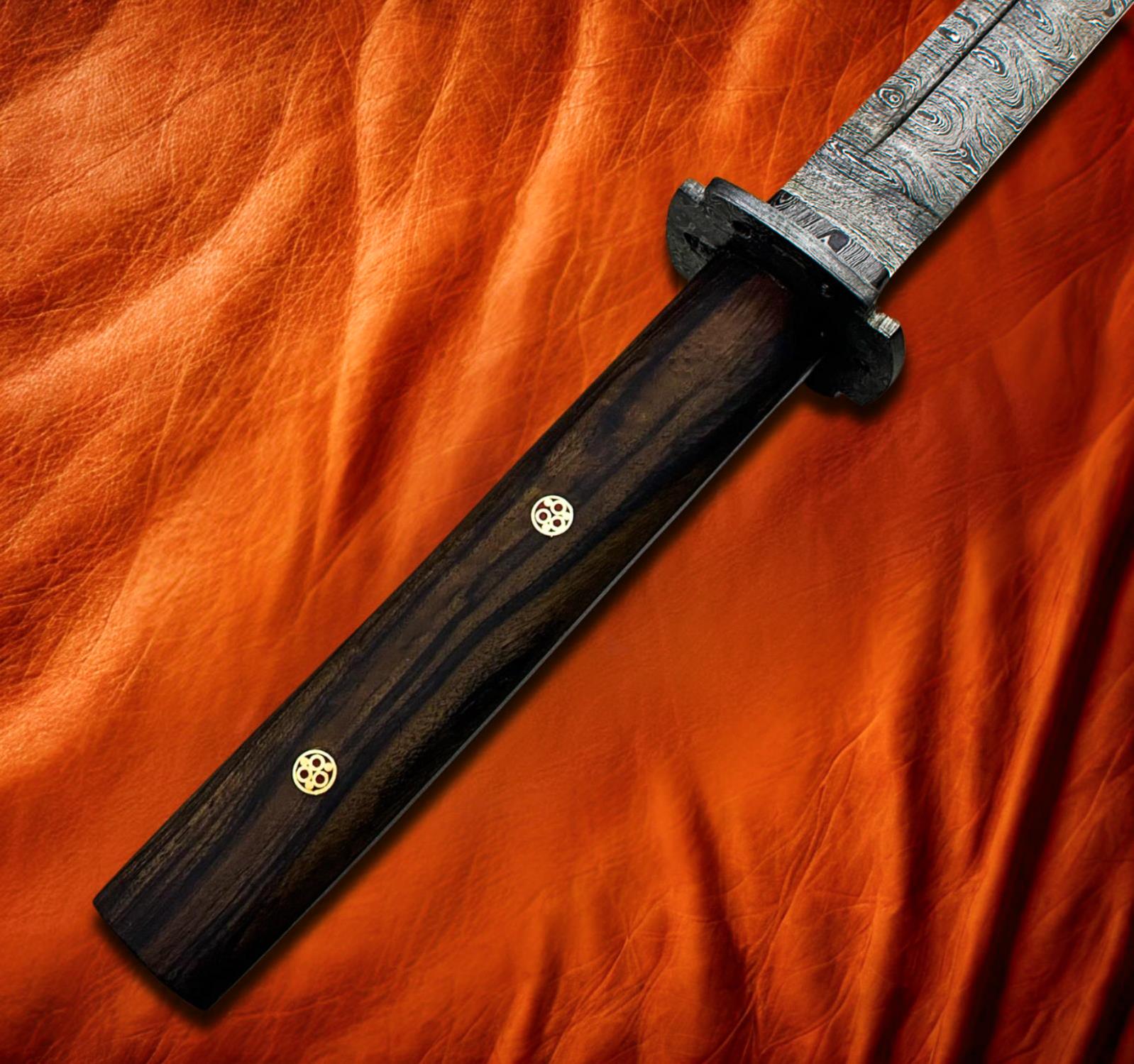 EL YAPIMI ÖZEL ÜST DÜZEY ŞAHESER DAMASCUS ÇELİK KÖK CEVİZ KABZELİ VE DERİ KILIFLI KATANA (Wakizashi)